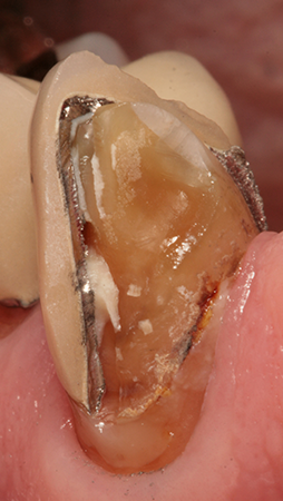 Cement layer with voids visible upon removal of a metal-ceramic restoration placed by another dental office. (Image courtesy of Frank Tussing, Gießen, Germany)