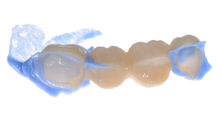 Use of Fit Checker™ Advanced Blue (GC Corporation) to assess the fit of a zirconia restoration. (Image courtesy of Hans-Jürgen Stecher, Germany)