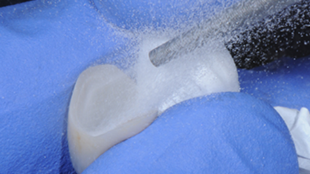 Pre-treat zirconia restorations by sandblasting. (Image courtesy of Prof. Jan-Frederik Gueth, Munich, Germany)