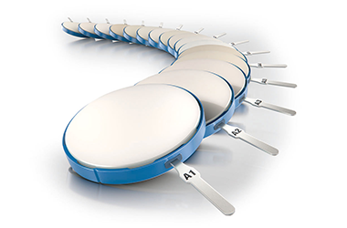 Das Material bietet Festigkeit & Sicherheit von der Einzelkrone bis hin zur 14-gliedrigen Brücke. Basierend auf der hohen Biegefestigkeit (1200 MPa im Dentinbereich bis zu 750 MPa in der Schneide) und langjähriger, dokumentierter Erfahrung. Es wird eine Farbsicherheit für alle 16 VITA Farben und BL2 gewährleistet. Vier integrierte Farbschichten führen nach dem Sintern zu einem Dentin-Schneideverlauf wie bei einem natürlichen Zahn. Ohne notwendige Verblendung. Darüber hinaus ist das Material leicht zu nesten. Es bietet identische Fräs- und Sinterprotokolle wie bei allen anderen Cercon-Zirkonoxidprodukten.