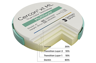 Unterschiedliche Schichten im Multilayer führen zu einem idealen Farbverlauf für eine schöne Ästhetik in der Restauration. Cercon xt ML ist ein extra transluzentes Zirkonoxid. Die Rohlinge bestehen aus unterschiedlichen Farbschichten, die einen natürlichen Farbverlauf in der gesinterten Restauration für die optimale Ästhetik in der zahntechnischen Arbeit erzeugen. Somit wird die Produktivität verbessert und eine sehr natürliche Ästhetik generiert.