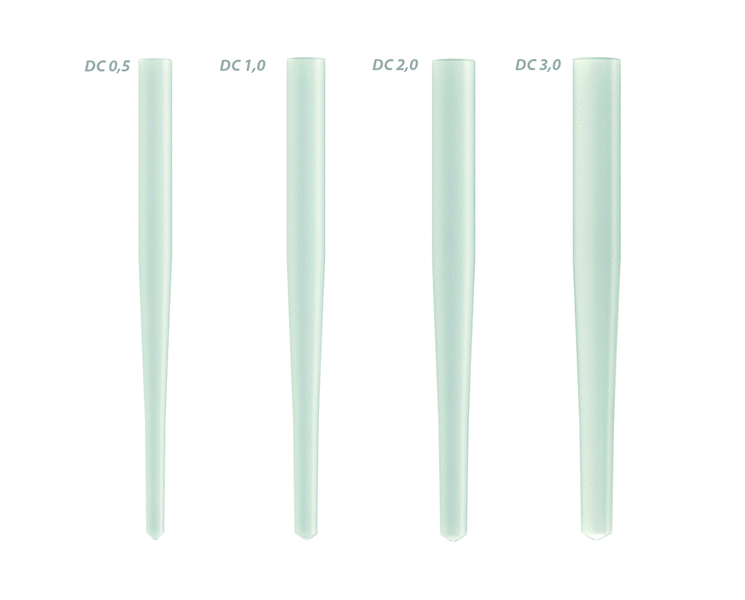 Wurzelkanalstifte aus Glasfaser in leicht konischer Form. Dank des Glasfaseranteils sehr hohe Biegefestigkeit für einen langlebigen Aufbau. Dank der hohen Transluzens auch sehr gut geeignet bei einer hochästhetischen Versorgung im Frontzahnbereich.