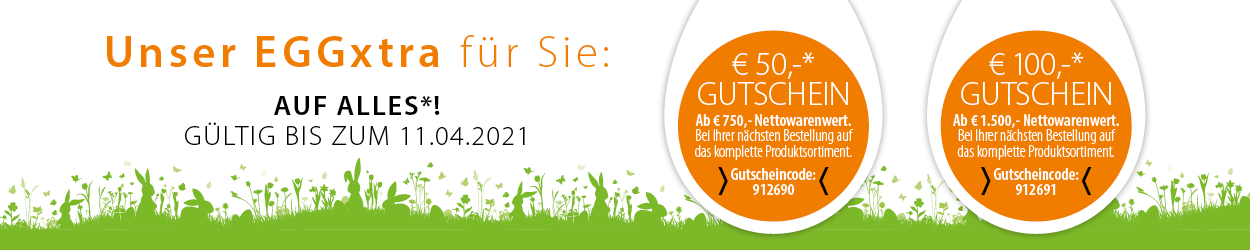* Die Gutscheincodes sind bis zum 11.04.2021 einlösbar und gelten auf unser gesamtes Produktsortiment ab dem jeweils oben genannten Nettowarenwert. Er kann nur einmalig unter Angabe des o. g. Gutscheincodes eingelöst werden. Bei Onlinebestellung im Warenkorb unter Gutscheincode eingeben und 6-stelligen Gutscheincode auswählen. Der Betrag kann nicht in bar ausgezahlt oder mit zurückliegenden Bestellungen verrechnet werden und ist nicht mit anderen Aktionen kombinierbar. Ausgenommen vom Nachlass sind M+W Repair & Care Leistungen und CAD/CAM Leistungen, technischer Service und Einrichtungsgeräte. Irrtümer und Änderungen vorbehalten.