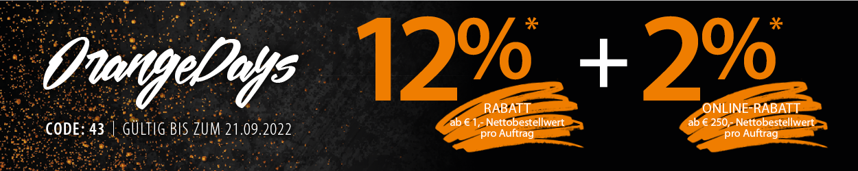 * Bis zum 21.09.2022 erhalten Sie ab einem Nettowarenwert von € 1,- 12% Rabatt auf Alles. Bei Online-Bestellungen erhalten Sie ab einem Nettowarenwert von € 250,- zusätzlich 2% Online-Rabatt. Nur gültig unter Angabe des Rabattcodes 43. Ausgenommen sind M+W Repair & Care Leistungen, CAD/CAM Leistungen, technischer Service, Einrichtungsgeräte sowie nicht rabattierfähige, preisgebundene und vom Hersteller für Aktionen ausgeschlossene Artikel. Die Rabatt-Aktion ist nicht mit anderen Aktionen kombinierbar und schließt unsere üblichen Auftragsrabatte und auch sonstige Sonderrabatte aus. Irrtümer und Änderungen vorbehalten.