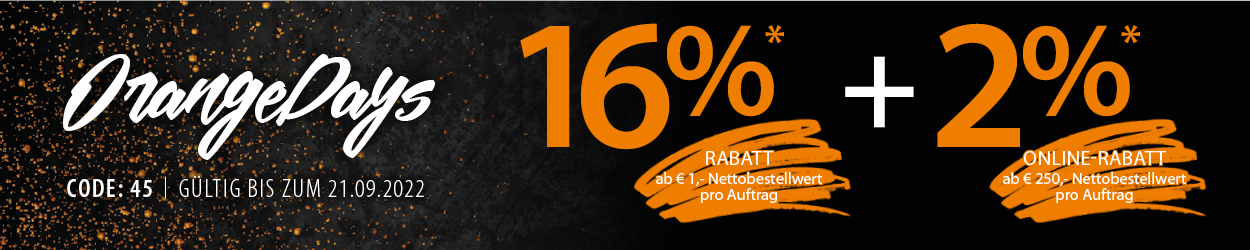 * Bis zum 21.09.2022 erhalten Sie ab einem Nettowarenwert von € 1,- 16% Rabatt auf Alles. Bei Online-Bestellungen erhalten Sie ab einem Nettowarenwert von € 250,- zusätzlich 2% Online-Rabatt. Nur gültig unter Angabe des Rabattcodes 45. Ausgenommen sind M+W Repair & Care Leistungen, CAD/CAM Leistungen, technischer Service, Einrichtungsgeräte sowie nicht rabattierfähige, preisgebundene und vom Hersteller für Aktionen ausgeschlossene Artikel. Die Rabatt-Aktion ist nicht mit anderen Aktionen kombinierbar und schließt unsere üblichen Auftragsrabatte und auch sonstige Sonderrabatte aus. Irrtümer und Änderungen vorbehalten.