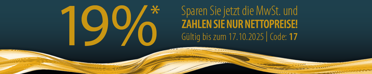 *Bis zum 17.10.2025 erhalten Sie ab dem € 1,- 15,97% Rabatt auf das komplette M+W Sortiment. Umgerechnet zahlen Sie so nur den Nettopreis. Die MwSt. müssen wir auf der Rechnung natürlich dennoch ausweisen. Bei Online-Bestellungen erhalten Sie ab einem Nettowarenwert von € 250,- zusätzlich 2% Online-Rabatt.