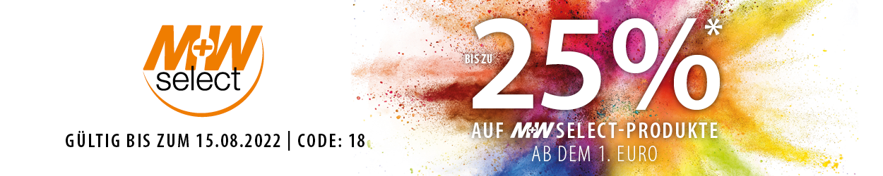 * Bis zum 15.08.2022 erhalten Sie ab einem Nettowarenwert von € 1,- 23% Rabatt auf das gesamte M+W Select Sortiment. Bei Online-Bestellungen erhalten Sie ab einem Nettowarenwert von € 250,- zusätzlich 2% Online-Rabatt. Nur gültig unter Angabe des Rabattcodes 18. Ausgenommen sind M+W Repair & Care Leistungen, CAD/CAM Leistungen, technischer Service, Einrichtungsgeräte sowie nicht rabattierfähige, preisgebundene und vom Hersteller für Aktionen ausgeschlossene Artikel. Die Rabatt-Aktion ist nicht mit anderen Aktionen kombinierbar und schließt unsere üblichen Auftragsrabatte und auch sonstige Sonderrabatte aus. Irrtümer und Änderungen vorbehalten.