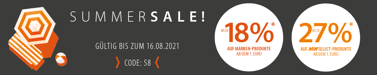 * Bis zum 16.08.2021 erhalten Sie ab dem € 1,- 16% Rabatt auf alle Marken-Produkte und 25% Rabatt auf alle M+W Select-Produkte. Für Onlinebestellungen ab einem Nettowarenwert von € 250,- erhalten Sie zusätzlich 2% Online-Rabatt.
